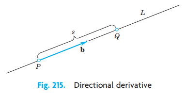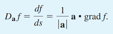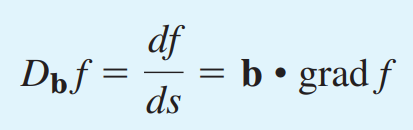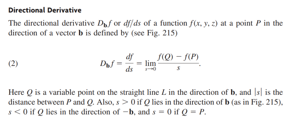 점 P에서 f(x,y,z)의 벡터 b 방향으로의 방향도함수 Dbf 또는 df/ds 는 식 (2)와 같이 정의됩니다.