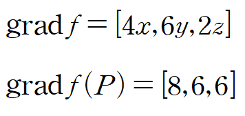 (예제) 주어진 f(x,y,z)와 점 P(2,1,3)에 대하여 a = [1,0,-2] 방향으로의 방향도함수를 계산하여라