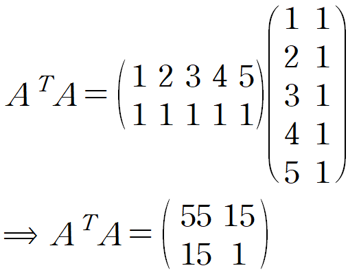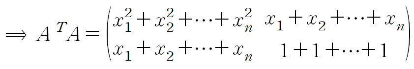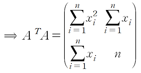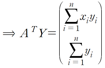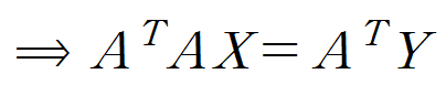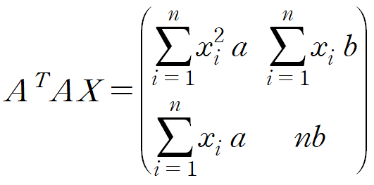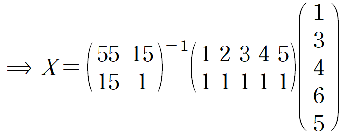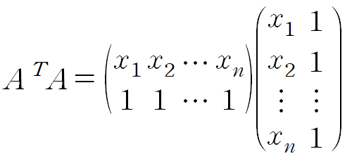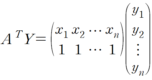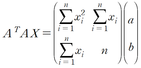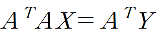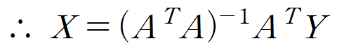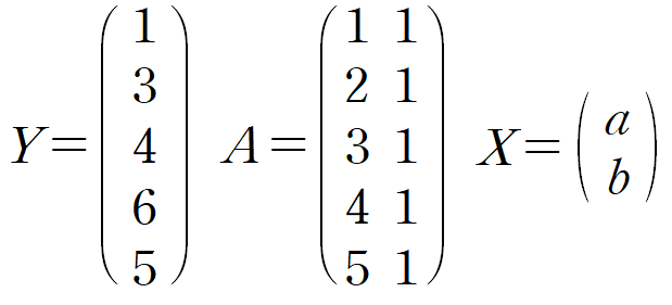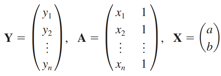 Y는 데이터의 y값들, A는 데이터의 x값들과 크기가 n이고 모든 요소가 1인 열벡터를 나란히 놓은 것, X는 우리의 목표인 y = ax + b 의 계수입니다.