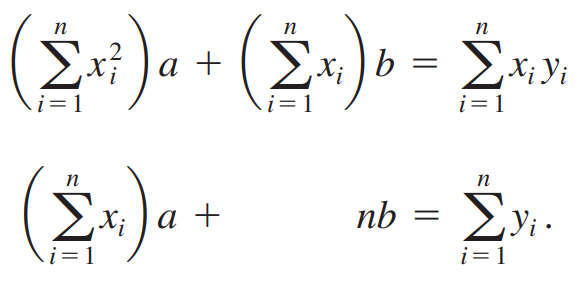 최소제곱합 E가 최소가 되게하는 두 편미분 관계식으로부터 다음 식을 얻습니다.