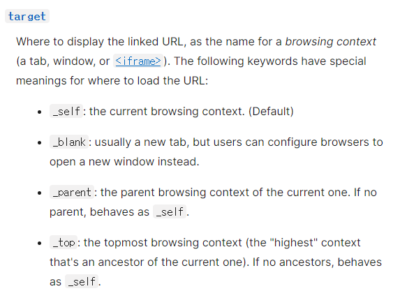 또한 target 속성을 사용해 현재 보고 있는 창에서 연결된 링크로 이동할 지, 새 창에서 이동할 지 등을 설정할 수도 있다.