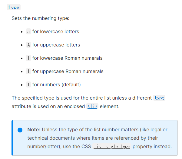 <ol type="1"> <!-- 1,2,3(기본값) -->