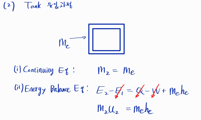 초기에 비어있었고 어떠한 열교환이나 일이 일어나지 않았으므로 에너지 방정식은 좌우 한 텀씩만 남습니다.