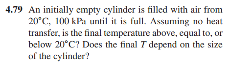 공기가 다 채워졌을 때 final temperature가 유입온도인 20도보다 높아지는지, 같은지, 낮아지는지 물어보고 있습니다.