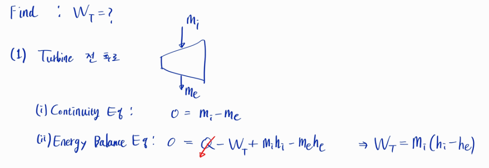 먼저 터빈을 지나는 정상상태 유동을 보겠습니다. adiabatic 이므로 열에너지 Q가 없습니다.