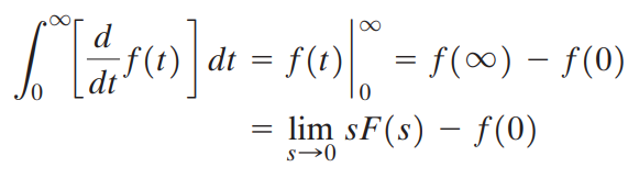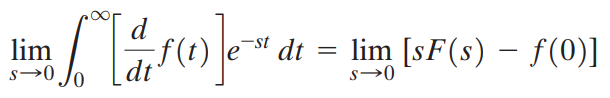 도함수 f'(t)의 라플라스 변환에 s->0 극한을 취함으로 간단히 증명할 수 있습니다.