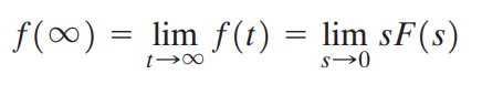 최종값 정리는 f(t)의 steady state(정상 상태)와 관련이 있습니다. 초기에 시스템이 인풋을 받은 이후로 긴 시간이 흐르면 시스템은 일정한 움직임을 보입니다. 즉 f(t)의 양의 무한대 극한에 관한 이야기입니다.