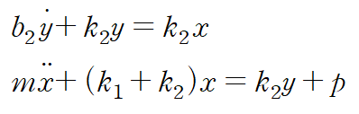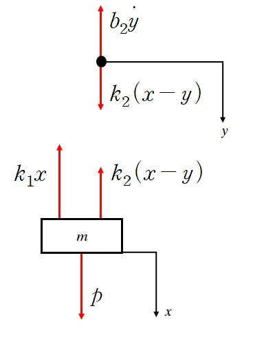 2. 상대변위 개념 : 마찬가지로 스프링요소 k2에 작용하는 힘을 k2(x-y)라 세웁니다.