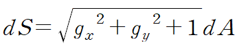 dS는 곡면의 미소면적이고 dA는 곡면 S를 xy평면 (z = g(x,y)의 경우) 으로 사영(projection)시킨 영역 R의 미소면적 입니다.