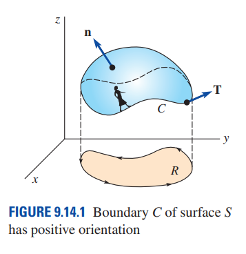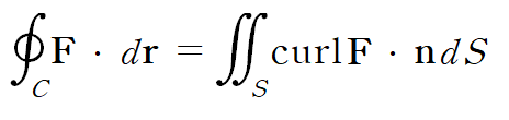 "S를 부분적으로(piecewise) 매끄러운 닫힌 곡선 C로 둘러싸인 부분적으로(piecewise) 매끄러운 곡면이라 하자. 벡터함수 함수 F(x,y,z)의 x, y, z 편도함수가 곡면 S를 포함하는 공간에서 모두 연속일 때 다음 식이 성립한다."