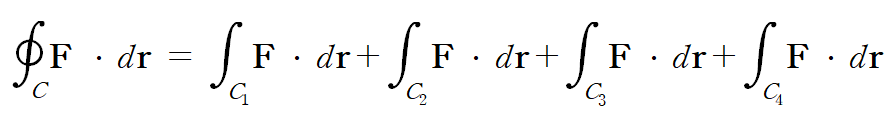 곡선이 네 개의 구간으로 나누어 표현이 되니 F의 선적분은 아래와 같이 네 번의 연산을 요구합니다.