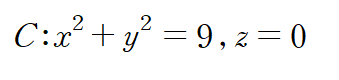 이때 곡면을 둘러싸는 곡선 C는 반지름이 3이고 중심이 (0,0)인 xy 평면상의 원입니다.