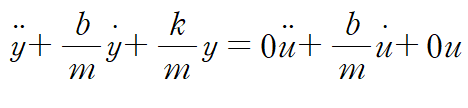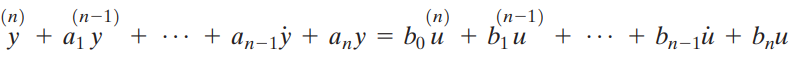 여기서 주의할 점은 좌변에서 output 최고계도함수의 계수가 1이라는 것과 우변 input function들은 좌변의 output 최고계도함수의 미분차수를 따라서 설정해야 한다는 것입니다.( 좌변에는 y''이 있고 우변에는 u'만 존재한다면 0u'' 처럼 써줘야 함)