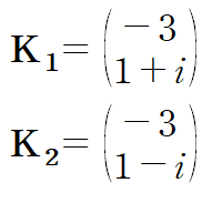 - complex eigenvalue λ = α + βi 에 대응하는 고유벡터 K 의 켤레복소벡터는 켤레복소수 고윳값에 대응하는 고유벡터입니다.
