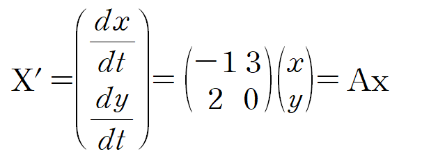 위 연립 미분방정식을 행렬 형태로 표시합니다.