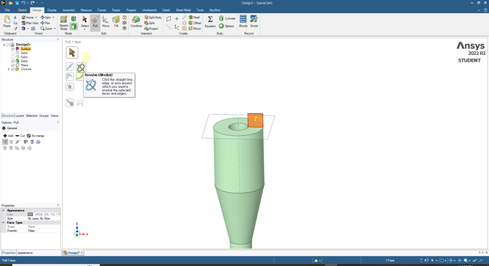 (2) 스케치한 도형 선택 후 Design - Pull 을 통해 Solid를 생성할 수 있다.