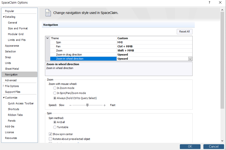 (1) 마우스 휠 확대 / 축소를 변경하고 싶을 때는 좌측 상단 File - SpaceClaim Options - Navigation에서 downward를 upward로 바꾸면 된다.