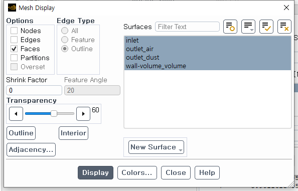 이때 앞서 설정한 injection을 선택해주고 좌상단 Options에서 Draw Mesh를 선택해줘야만 형상 윤곽이 보인다.