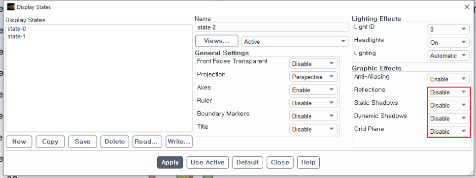 만약 배경화면을 깔끔하게 설정하고 싶다면 상단 View 탭 - Display - Display States 에서 Reflections, Shadow 설정과 Grid Plane 설정을 Disable로 선택하면 된다.