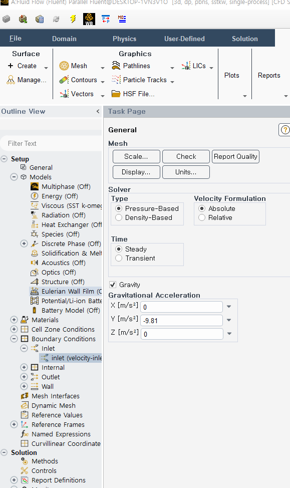 Setup - Boundary Conditions - Inlet 에서 미리 mesh 단계에서 설정한 inlet을 더블클릭
