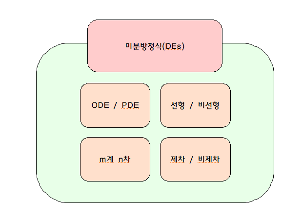 영어 약어 표현은 ODE와 PDE인데, 일단 DE는 Differential Equation이고 각각 상미분을 뜻하는 Ordinary와 편미분을 뜻하는 Partial을 앞에 붙여 ODEs, PDEs라 부른다.
