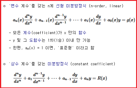 다른 도함수의 거듭제곱 차수는 상관이 없다. 최고계도함수만 보면 된다. 편미분은 따로 다루지 않겠다. d 대신에 ∂가 있으면 편미분 방정식이니까. 근데 사실 우리가 다룰 미분방정식은 n계 1차 상미분방정식(선형 상미분 방정식)이 99%이기 때문에 이렇게 분류한다 정도만 알고 있으면 된다.