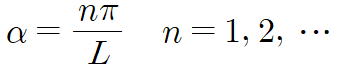 해당 삼각방정식의 해는 αL = nπ 일 때 이므로 α는 자연수 n을 사용해 다음과 같이 나타낼 수 있습니다.