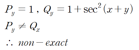 cos(x+y)를 양변에 곱하면 완전미분방정식을 얻을 수 있습니다.