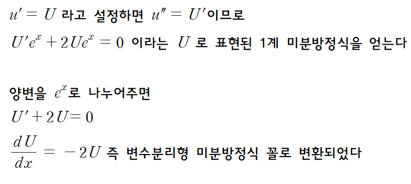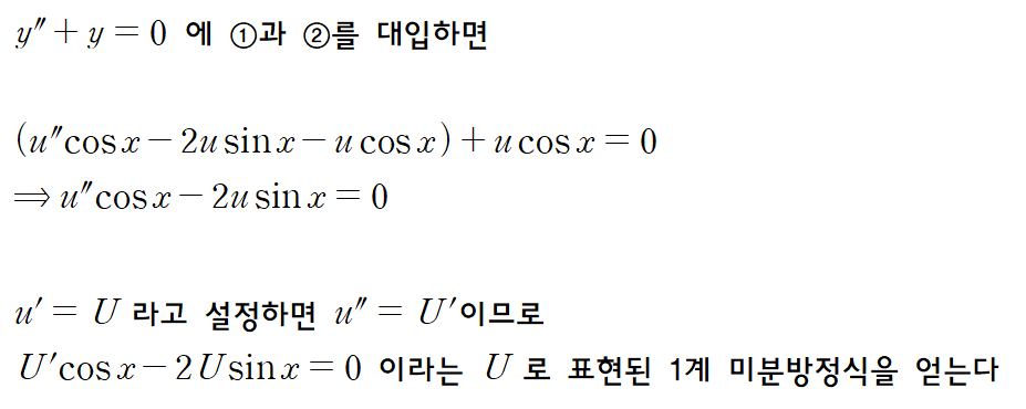 라고 다른 해를 설정하고(y1는 이미 알고 있는 해 / u는 미지함수 u(x)) 주어진 미분방정식에 대입하는 과정을 통해 y2를 구합니다
