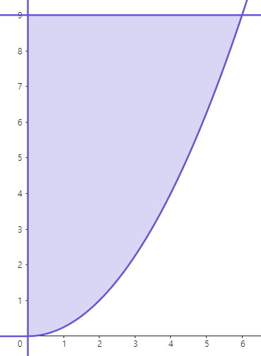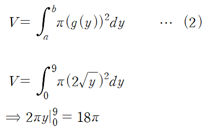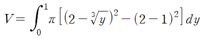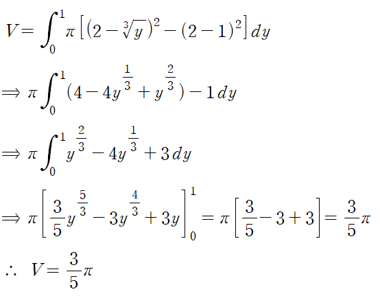 (예제 7) 아래 그림과 같이 둘러싸인 영역을 y축에 대해 회전한 회전체의 부피를 구하여라