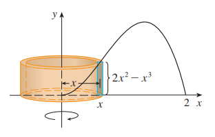 위 영역을 x = 2에 대해 회전시킨 회전체의 부피는 다음과 같습니다.