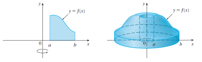아래와 같이 y = f(x), x = a, x = b, y = 0으로 둘러싸인 영역을 y축에 대해 회전한 회전체의 부피를 구해봅시다.