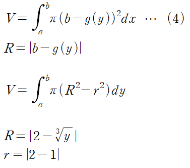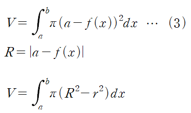 영역을 y = -3에 대해 회전시키게 되면 도넛처럼 빈 공간이 나오게 됩니다. 이 빈공간을 빼줘야 하기 때문에 다음과 같은 식을 사용하여 회전체의 부피를 계산할 수 있습니다.