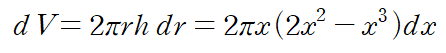 이 두께가 얇은 원통의 부피는 (밑면의 둘레 * 높이 * 두께(이 경우 dx))로 근사됩니다.