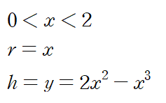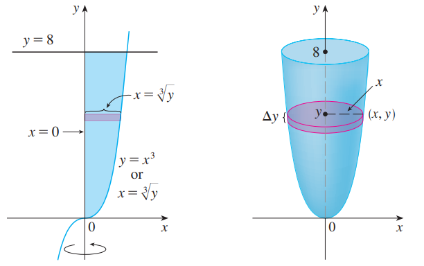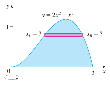 예를 들면 아래 그림이 나타내는 영역을 y축으로 회전시켜 얻은 회전체의 부피를 구하는 것은 기존 disk method로 풀려면 x = g(y) 꼴의 함수를 얻어야만 하는데 이는 삼차방정식의 해로부터 얻어지며 또한 회전체 내부, 외부의 x 좌표를 각각 이끌어내는 것이 쉽지 않습니다.