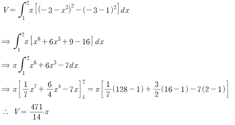 (예제 3) 아래 곡선들로 둘러싸인 영역을 y = -3 에 대해 한 바퀴 회전시킨 회전체의 부피를 구하여라