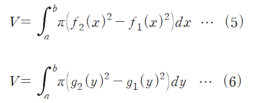 (5) : y = f2(x)와 y = f1(x) 사이의 영역을 회전시킨 경우. f2가 f1보다 회전축에서 멀리 있어야 합니다(outer radius > inner radius)