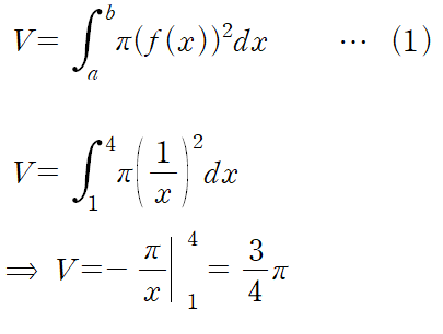 위 영역을 x축에 대해 회전시킨 회전체의 부피는 다음과 같습니다.