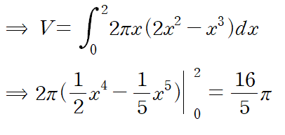 (예제 4) 아래 곡선들로 둘러싸인 영역을 x = 2 에 대해 한 바퀴 회전시킨 회전체의 부피를 구하여라