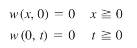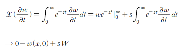 초기조건 w(0,t)=0의 양변에 라플라스 변환을 취하면 W(0,s)=0이 된다. 상미분방정식에서의 초깃값은 말 그대로 "값"이기 때문에 다른 액션을 취할 수 없지만 편미분방정식에서의 초기조건은 그 자체로 함수이기 때문에 갖가지 액션을 취할 수 있다.