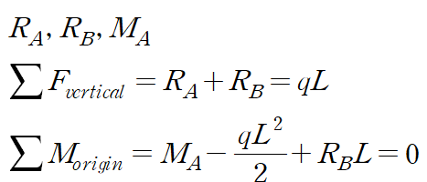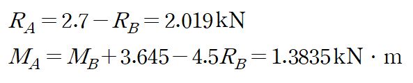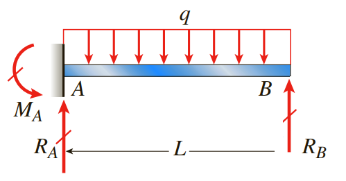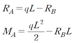 반력은 A점에서 2개(수직반력, 모멘트 반력), B점에서 2개(수직반력, 모멘트 반력), 합해서 4개이며 유도할 수 있는 방정식은 수평방향 힘의 평형 방정식을 제외한 2개입니다.