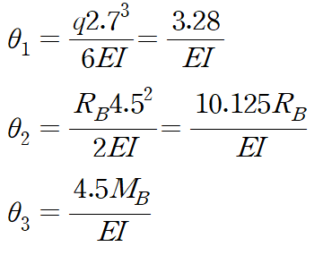 B에서 발생하는 두 개의 반력을 여분력으로 잡고 중첩법을 이용해 적합방정식을 세운다면 B에서의 처짐량과 처짐각이 0이라는 2개의 관계식을 추가로 유도할 수 있습니다.