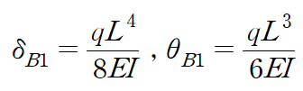 분포하중 q에 의한 B점에서의 처짐과 처짐각은 다음과 같습니다.