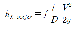 Major loss는 유체와 파이프의 마찰 때문에 발생하는 손실이며 다음과 같이 수두(head)형태 즉 미터 단위(또는 ft, in) 로 표현됩니다.