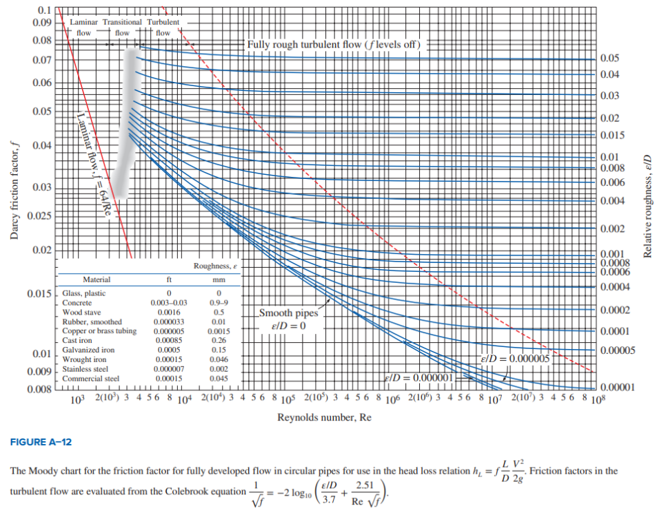 빨간색 선으로 영역이 구분되어 있는데 Laminar flow 영역에서는 달시 마찰 계수와 레이놀즈 수가 선형 관계임을, Fully rough turbulent flow 영역에서는 달시 마찰 계수가 비교적 일정함을 알 수 있습니다.