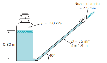 (예제 2) 분사 탱크에 부착된 노즐에서 물이 흐르고 있다. 그림에서 보여지는 것처럼 노즐의 손실 계수가 0.75이고 호스의 마찰 계수가 0.11인 경우 유량을 구하여라