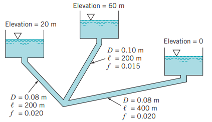 부손실(minor loss)을 무시할 때, 각 관의 유량을 결정하여라