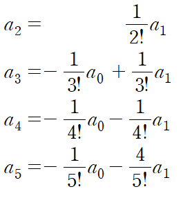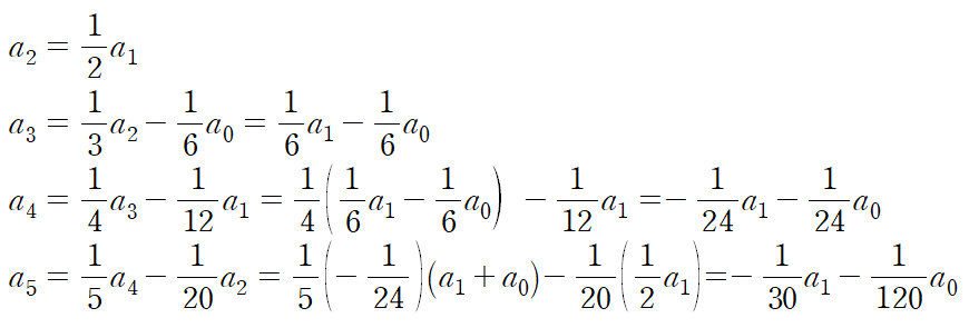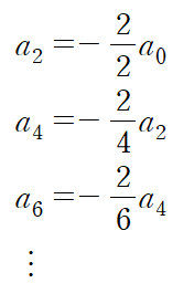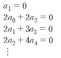 그다음으로는 이 미분방정식이 1계이므로 a0로 나머지 짝수 항들을 정리하여 규칙성을 찾는다.