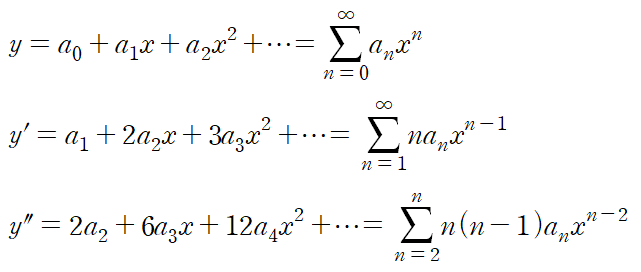 미분방정식의 해를 이러한 멱급수로 가정한 다음 해를 구하는 것을 멱급수 해법(Power Series Method)이라 한다.
