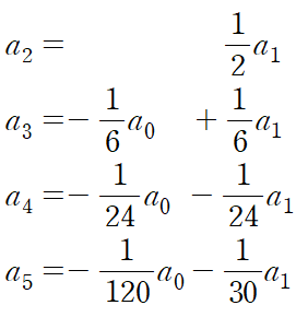 (예제 2) 급수해 방법으로 미분방정식을 풀어라. 이때 5차항까지만 해를 근사하여라